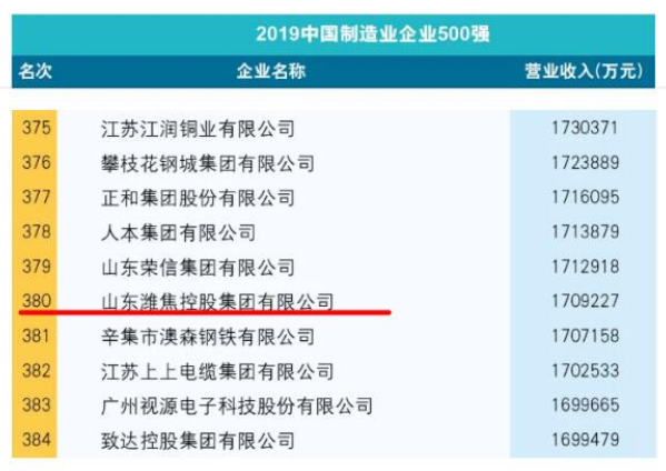近日,在2019中国500强企业高峰论坛上,中国企业联合会、中国企业家协会联合发布了“2019中国制造业企业500强”榜单,bv1946伟德官网再次荣登榜单,位列中国制造业企业500强第380位,比去年提高了一个位次。