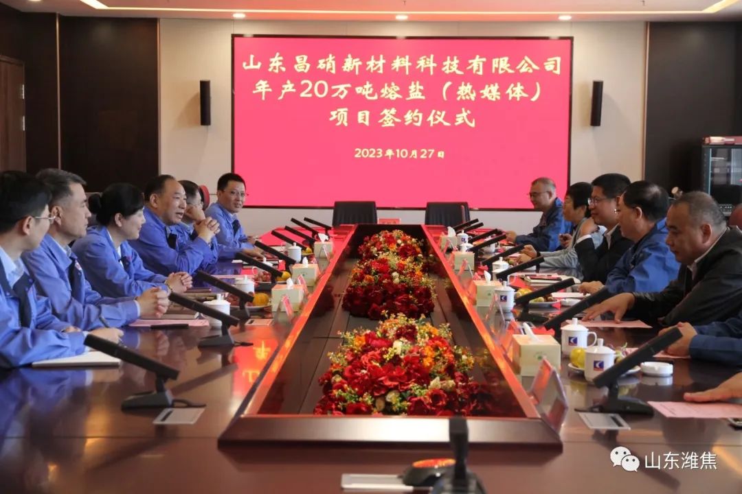 10月27日上午10:58分,山东昌硝新材料科技有限公司20万吨/年熔盐(热媒体 )项目合作签约仪式在集团总部举 行。潍坊昌盛硝盐投资公司董事长牟红光、潍坊振兴日升公司总经理刘峰祥作为合作双方代表进行签约。朱刘街道党工委书 记董建涛、昌乐县化工产业发展服务中 心主任王俊凤,集团董事长刘良玉、副总经理吕红,潍坊昌盛硝盐投资控股公司负责人牟邦志等出席签约仪式。签约仪式由集团公司总经理王读福主持。
