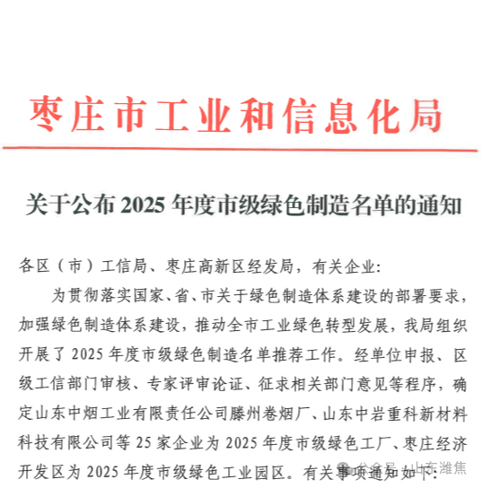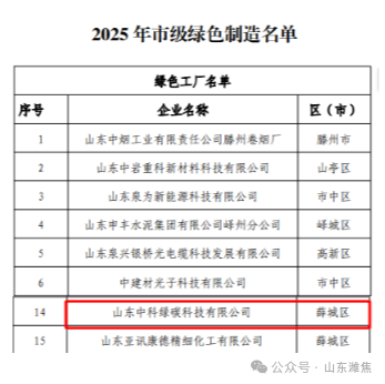 山东中科绿碳公司入选2025年枣庄市级绿色制造企业榜单