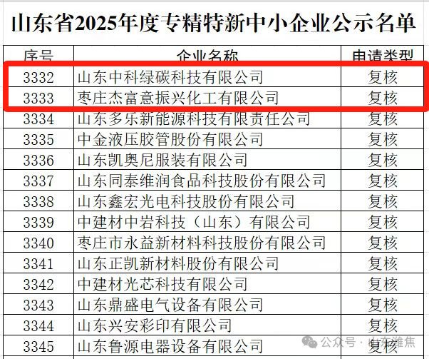 近日,山东省工信厅公布2025 年度专精特新中小企业名单,山东中科绿碳公司、枣庄杰富意公司顺利通过复核。