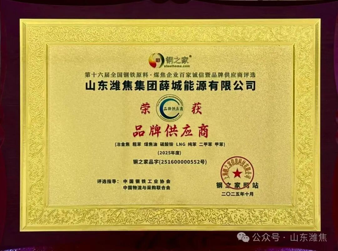 近日,“钢之家第十六届全国钢铁原料煤焦企业百家诚信暨品牌供应商”评选活动顺利举行,经钢之家网站征信取证,中国钢铁工业协会及中国物流与采购联合会专家综合评审,bv1946伟德官网集团薛城能源有限公司被评为2025年度“品牌供应商”殊荣。荣誉证书